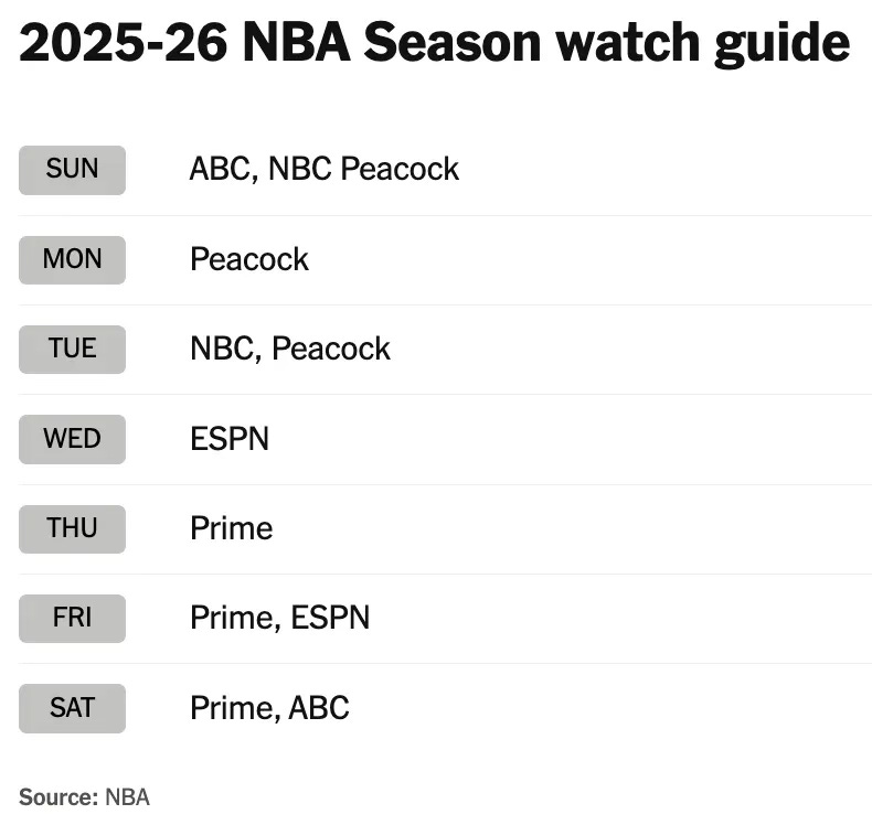 🗣️ Las críticas. La nueva estructura implica más fragmentación y coste para el aficionado, con múltiples suscripciones: Peacock (10,99$), Prime (8,99$), ESPN (29,99$) y League Pass (16,99$).