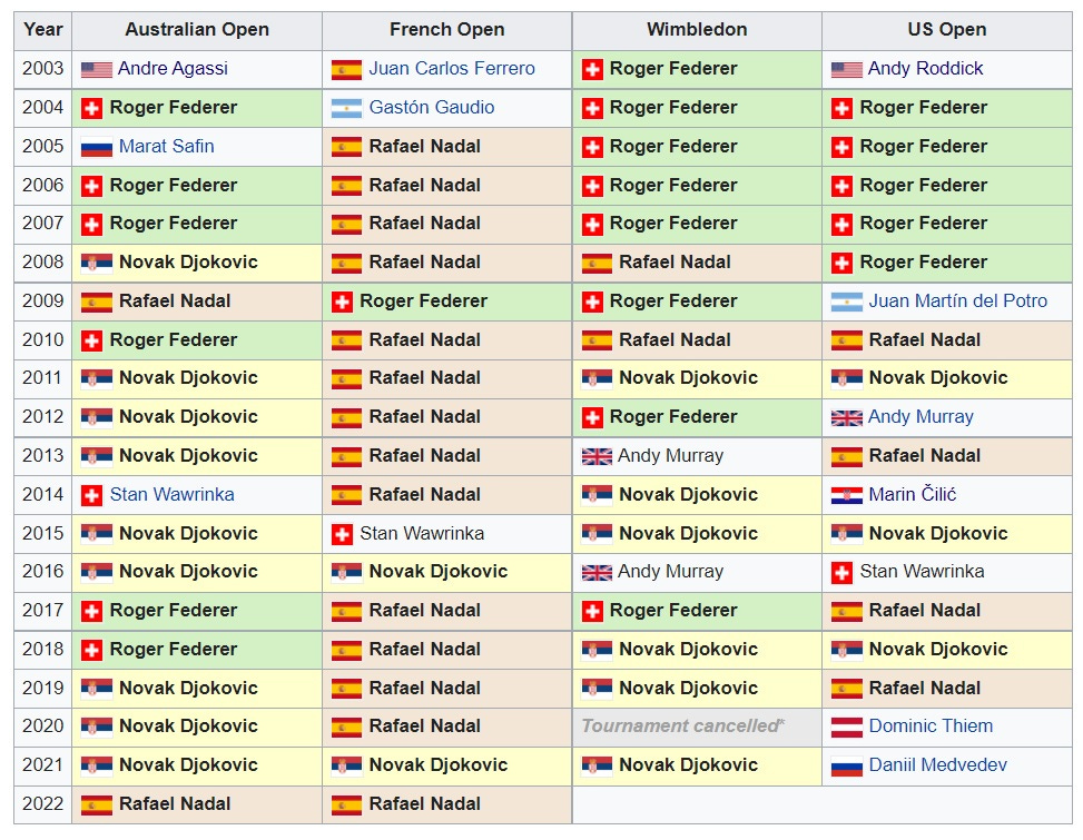 🤷🏻 ¿Por qué? Porque no hay tanta dispersión de campeones como para agruparlos por país o continente. La mayoría de títulos se reparten siempre entre los mismos nombres: Federer, Nadal, Djokovic. La concentración es brutal.