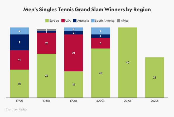 🤔 Un diagrama de barras por regiones para explicar de dónde vienen los ganadores de Grand Slam en categoría masculina suena bien… pero en tenis no tiene mucho sentido.