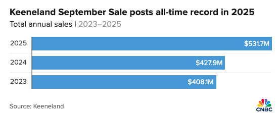 Mientras arte y vino flojean, las subastas de caballos de carreras baten récords: 531,7M$ en Kentucky, con 56 potros vendidos por más de un millón.