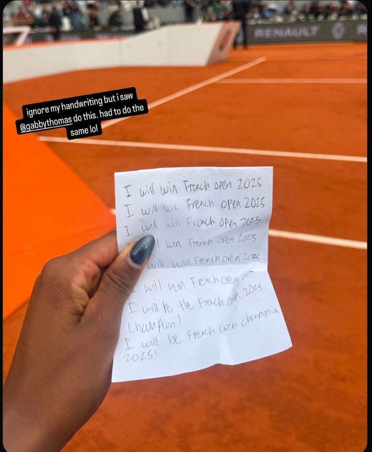 🔍 Cuando tienes foco no necesitas excusas. La estadounidense, de solo 21 años, no necesitó excusas. Necesitó concentración. Antes del torneo, escribió ocho veces en un papel: “I will win French Open 2025”. Fue su forma de anclar la presión, de convertirla en propósito.