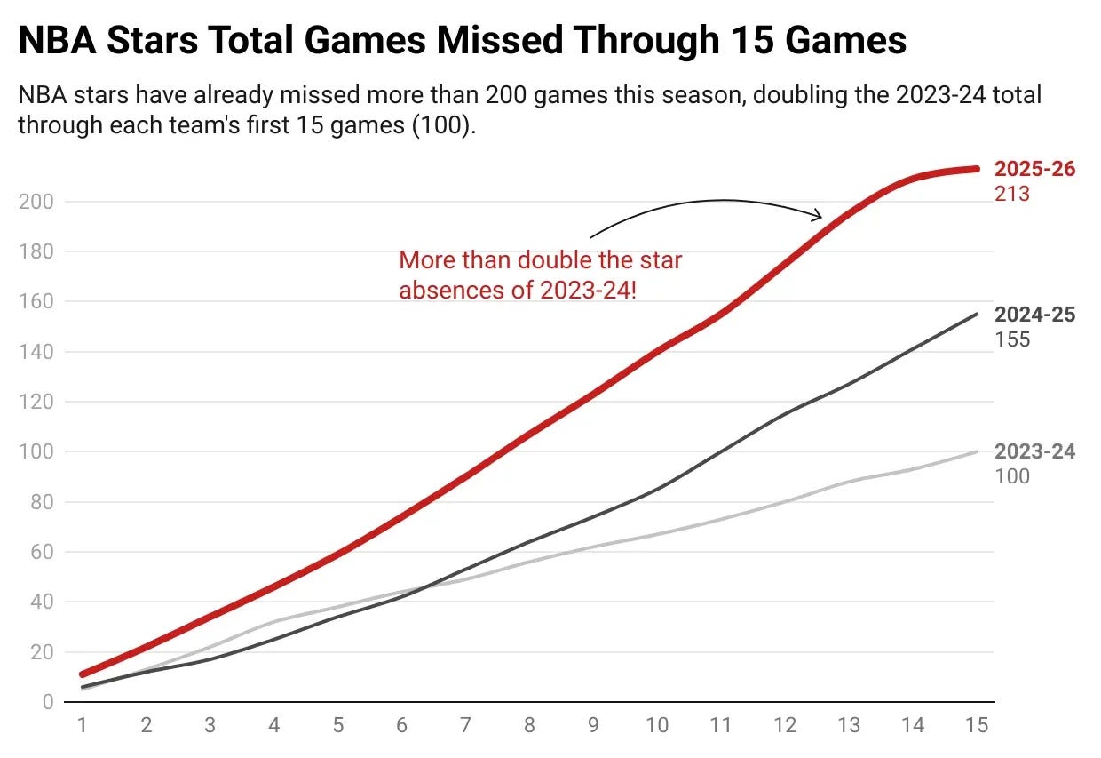 🏀 La NBA sufre una oleada de lesiones: 21 de 45 estrellas ya han perdido más de 200 partidos, el doble que hace dos años.