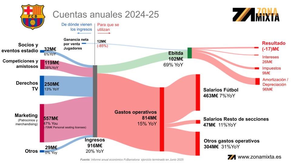 👉 Traducción: FC Barcelona vuelve a ganar dinero con su actividad normal. El problema ya no es tanto la cuenta de explotación anual, sino la mochila de deuda y derechos ya vendidos que lastran los ingresos del futuro.
