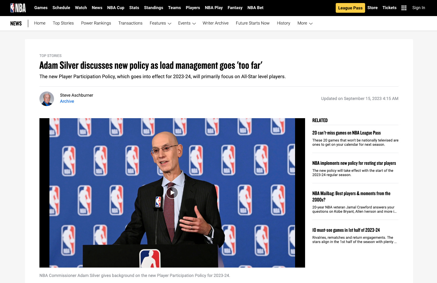 Adam Silver, comisionado de la liga, ha dejado claro que en una temporada de 82 partidos, los jugadores que estén aptos deben jugar. La NBA recientemente tuvo que crear una nueva regla que exige que las estrellas jueguen en partidos televisados a nivel nacional, tras varias situaciones en las que figuras clave como Curry o Antetokounmpo descansaron en partidos que quedaron descafeinados.
