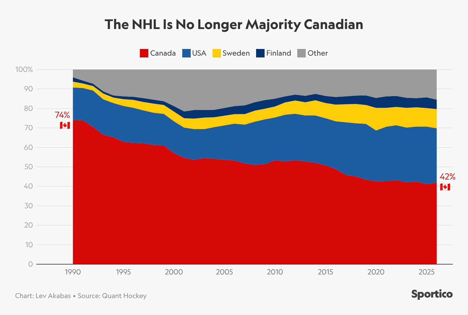 🇨🇦 🏒 Los jugadores canadienses ya no son mayoría en la liga de hockey sobre hielo más importante del mundo (y acaban de perder la final olímpica frente a EE.UU.)