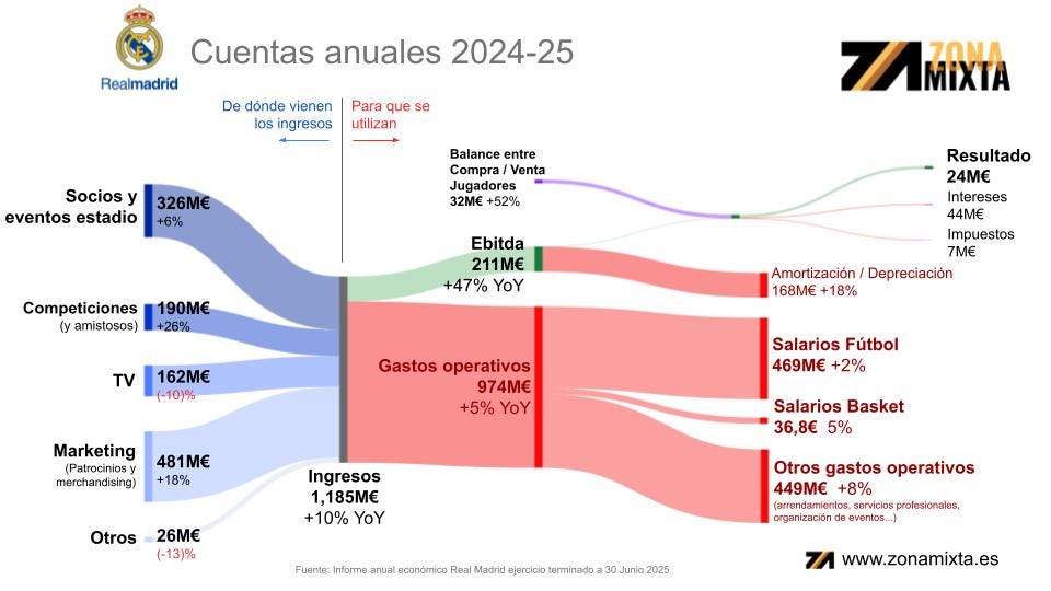 📣 Te cuento. Al examinar las cuentas del Real Madrid, todo el mundo mira lo más atractivo: salarios y fichajes. Pero el verdadero crecimiento está aquí: