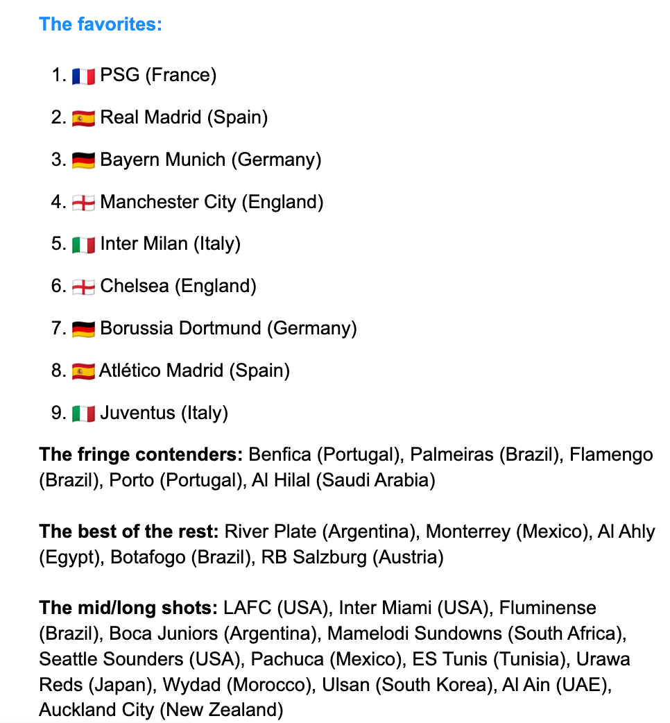 🌟 Favoritos para el mundial de clubes según los medios norteamericanos. Los equipos potentes de Argentina y Brasil no cuentan en las quinielas. Me parece aventurado por i) no hay histórico de enfrentamientos, ii) los equipos europeos llegan muy quemados mientras que los del continente americano (hemisferio sur) están a mitad de temporada.