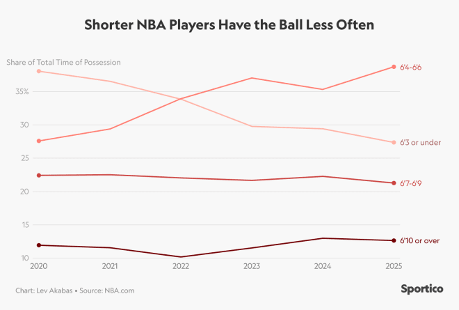 Esto también se ve en el gráfico: los jugadores de 6’4”–6’6” (entre 1,93 m y 1,98 m) han ganado protagonismo con el balón en los últimos años, mientras que los de 6’3” o menos han perdido cuota de posesión.