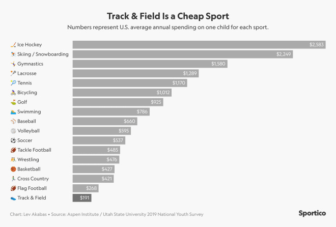 💸 ¿Cuanto cuesta que tu descendencia practique deporte? No hay duda, correr siempre ha sido lo más barato. Aún así, tengo ciertas dudas sobre si habrán incluido la ayuda con los gastos en los highschools y federaciones (o viajes), porque si no tiene sentido que la gimnasia sea notablemente más cara que el golf, y la natación que el football.