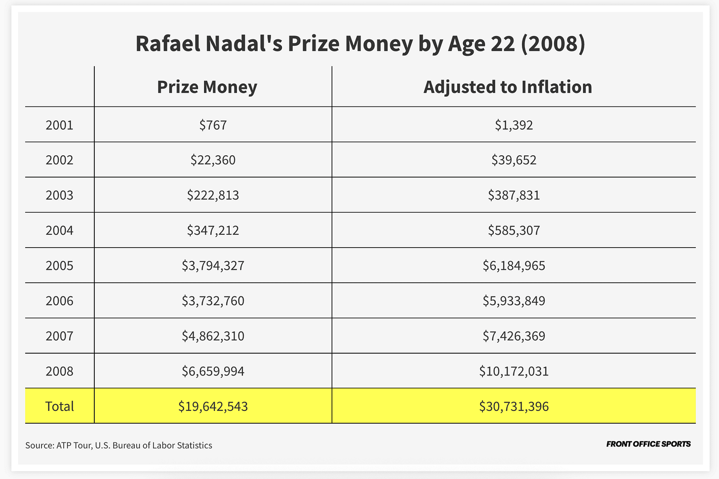 💸 Aún le queda mucho para alcanzar los 134,9M$ totales de Nadal, pero la brecha entre generaciones ya no es solo deportiva: es económica.