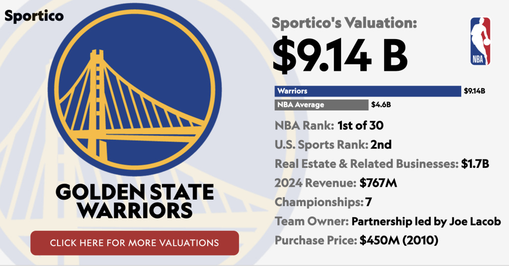 Qué te cuento. Madre mía, cómo han cambiado los Warriors. Han pasado de ser una franquicia que perdía dinero constantemente, y que rara vez participaba en los playoffs (a pesar de contar con leyendas como Hardaway, Mullin o Webber), a convertirse en un gigante financiero. Actualmente, el club tiene un valor de 9.140M$, solo superado por los Dallas Cowboys en el ámbito deportivo global. Su evolución podría convertirse en un estudio de caso de escuela de negocio. Pero yo te lo traigo antes en base a datos de Sportico.