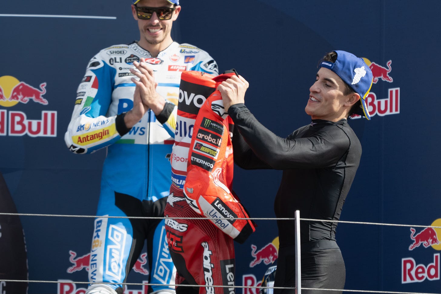 👉 Marc Márquez celebró con una bandera que se leía “Ducati Course” y luego en el podium se quito el mono para “venerarlo“ y así buscar una comunión con los tifossi italianos. Recuerda que no le aguantan por su enemistad con Rossi.
