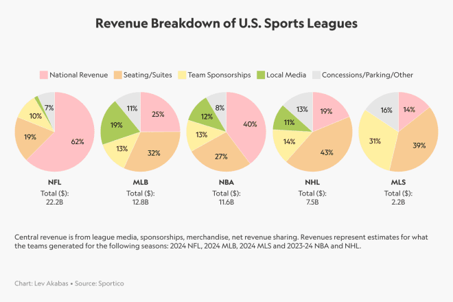 Local Media: Derechos televisivos y de streaming negociados a nivel local (club por club). Contratos de TV regional. MLB depende mucho de esto (31%) porque cada club negocia con su propia cadena local, a diferencia de la NFL donde es 0% (todo centralizado).