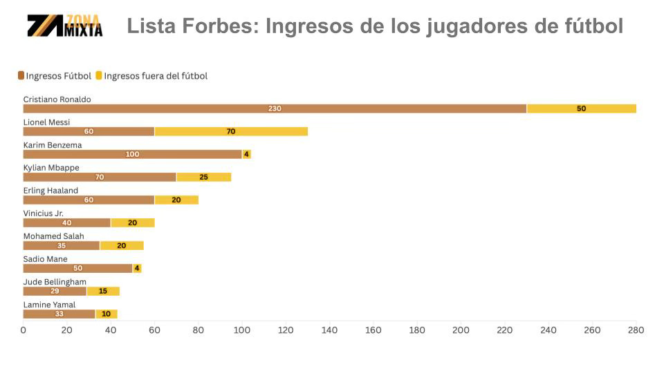 ⚽️ Lista Forbes de los ingresos anuales generados por los jugadores de fútbol entre salarios del club y patrocinadores.