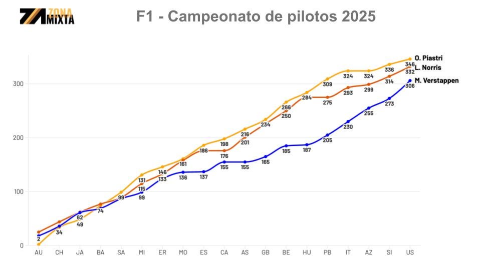 A falta de cinco carreras —México, Brasil, Las Vegas, Catar y Abu Dabi— el campeonato entra en una fase crítica: si Verstappen mantiene su ritmo de victorias, el tetracampeón llegaría con opciones muy reales a la última carrera.