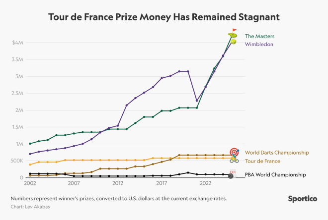 Y si te preguntas que ha pasado con la vuelta… En 2005 el ganador se llevaba 110K€ y en 2025 se lleva 150K€. Ha crecido más que el tour aunque todavía no le alcanza (unos 500K$ con crecimiento prácticamente plano).