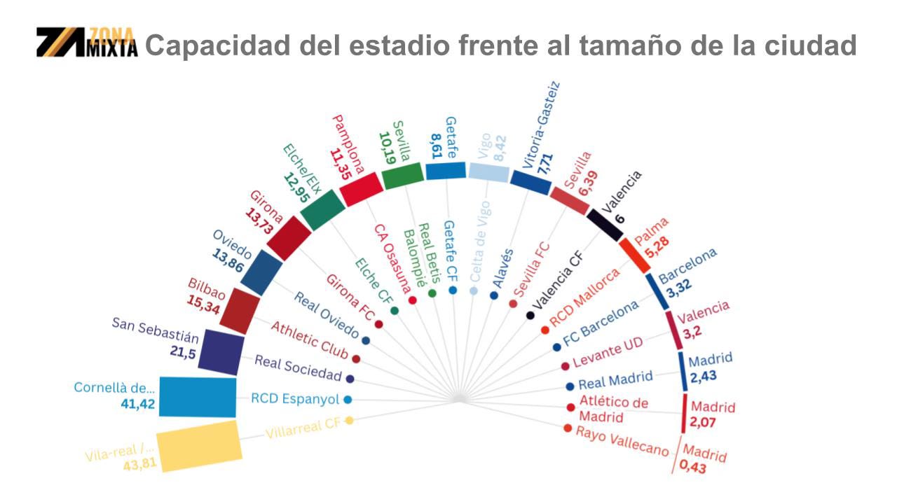 En la gráfica puedes ver el ratio entre el tamaño del estadio en comparación con la población donde juega. A menor ratio más posibilidades de monetización.