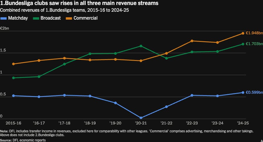 📈 ⚽ Bundesliga, récord histórico y rentable. Cerró 2024-2025 con más de 6.000M$ en ingresos, +7,9% interanual, el mejor dato de su historia. Los 36 clubes (Bundesliga y Bundesliga 2) lograron además 271,5M$ de beneficio operativo conjunto.
