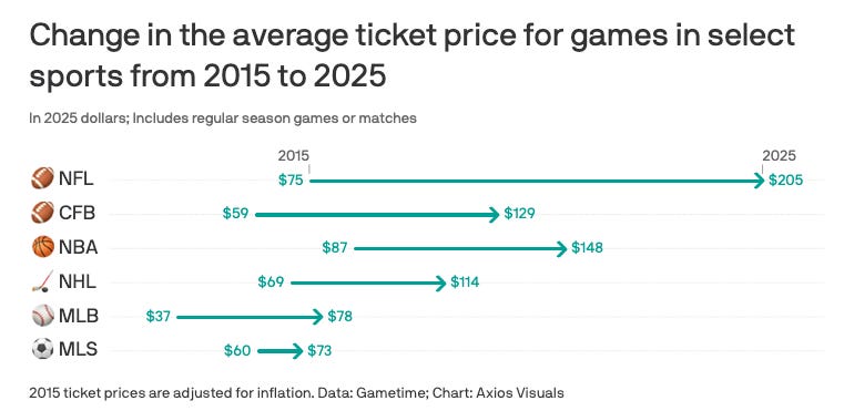🎟️📈 Entradas en eventos deportivos y cliente premium en EE.UU. Los precios de las entradas deportivas han subido muy por encima de la inflación en la última década, con los asientos premium disparándose.