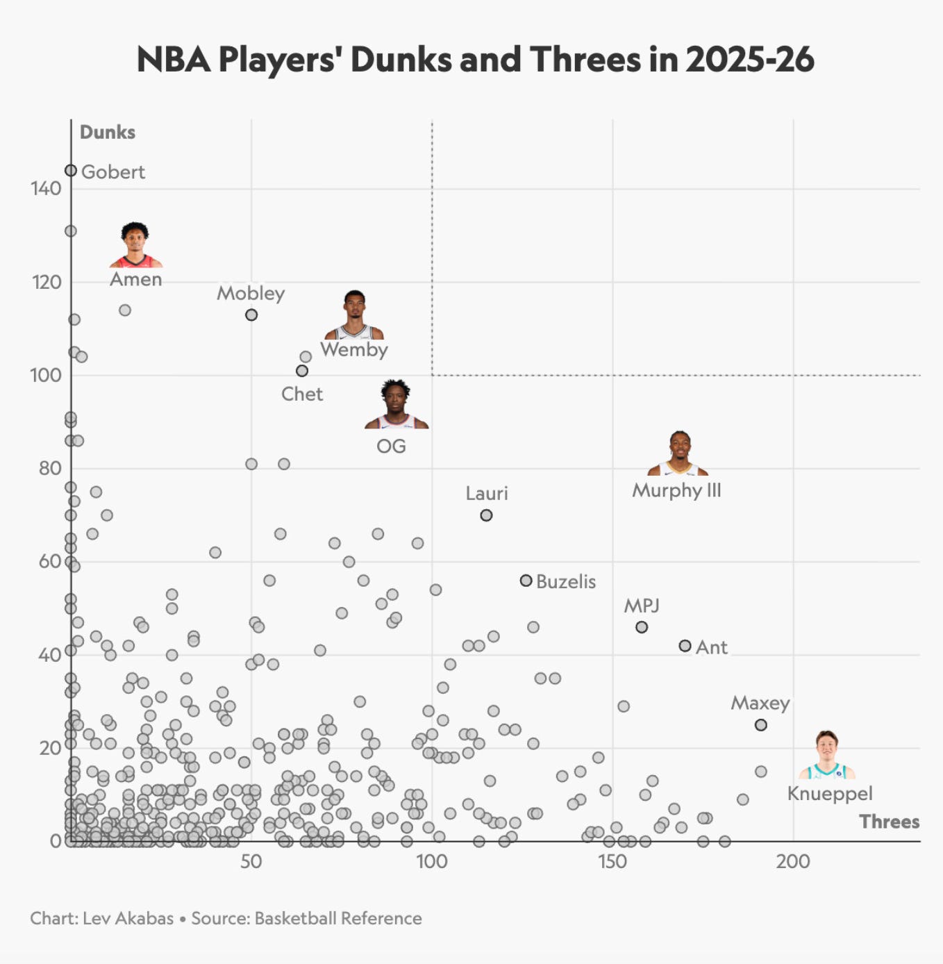 🇺🇸 NBA. En un eje, cuántos mates has hecho; en el otro eje, cuántos triples has metido. Gráfica tontuna pero pintona.